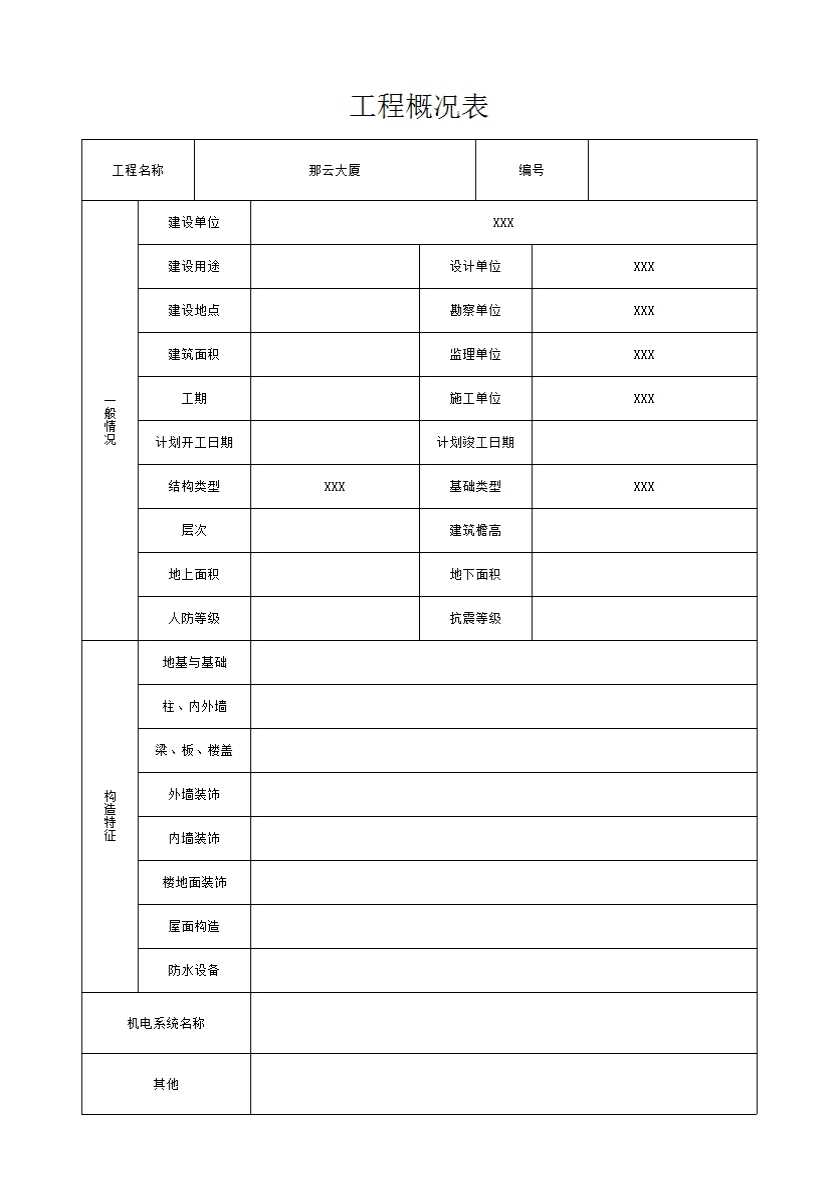 表格名称:工程概况