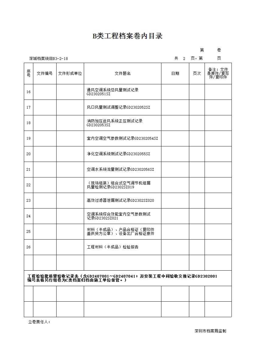 B类工程档案卷内目录