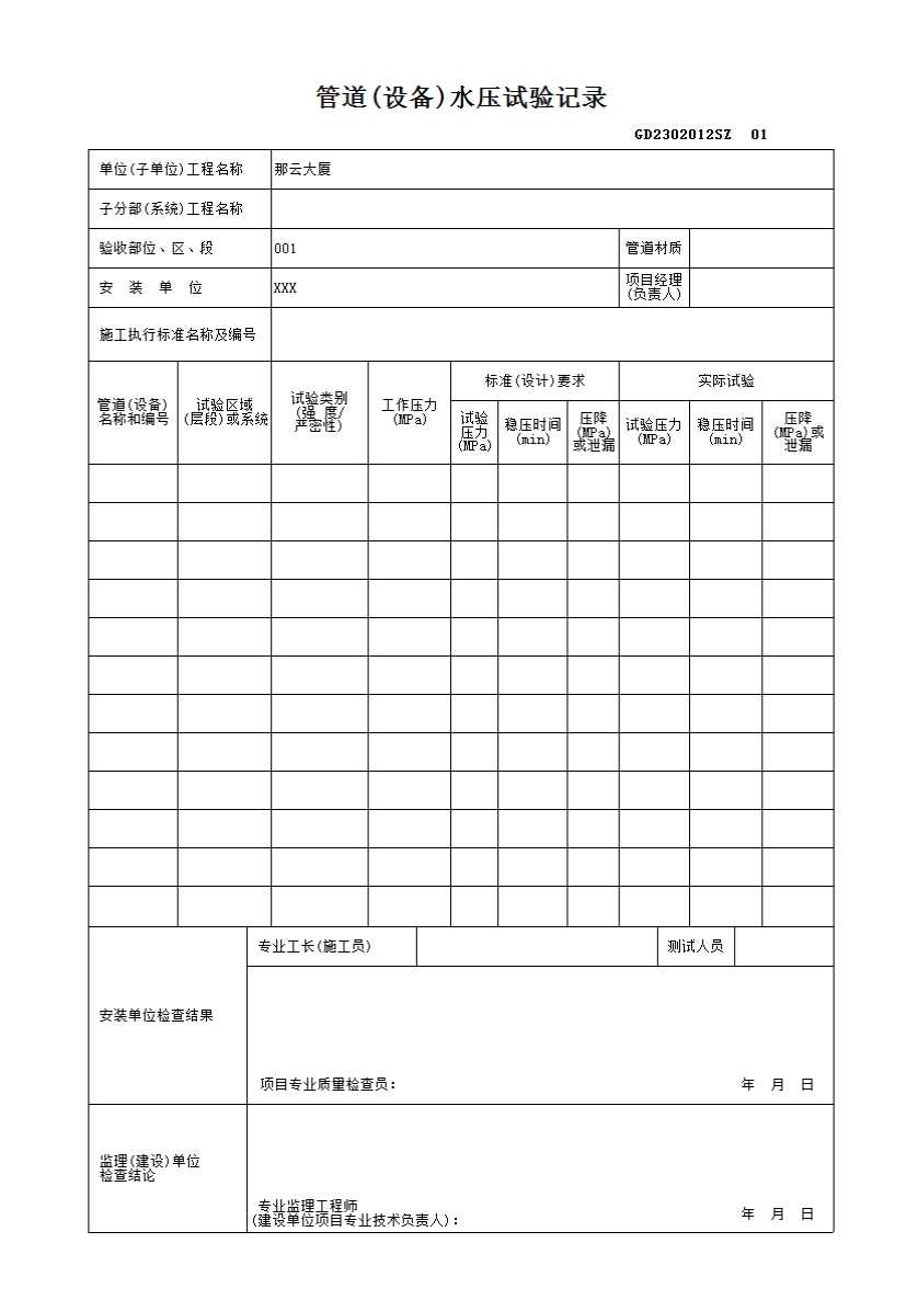 表格名称:管道系统(设备)水压试验记录(通用)