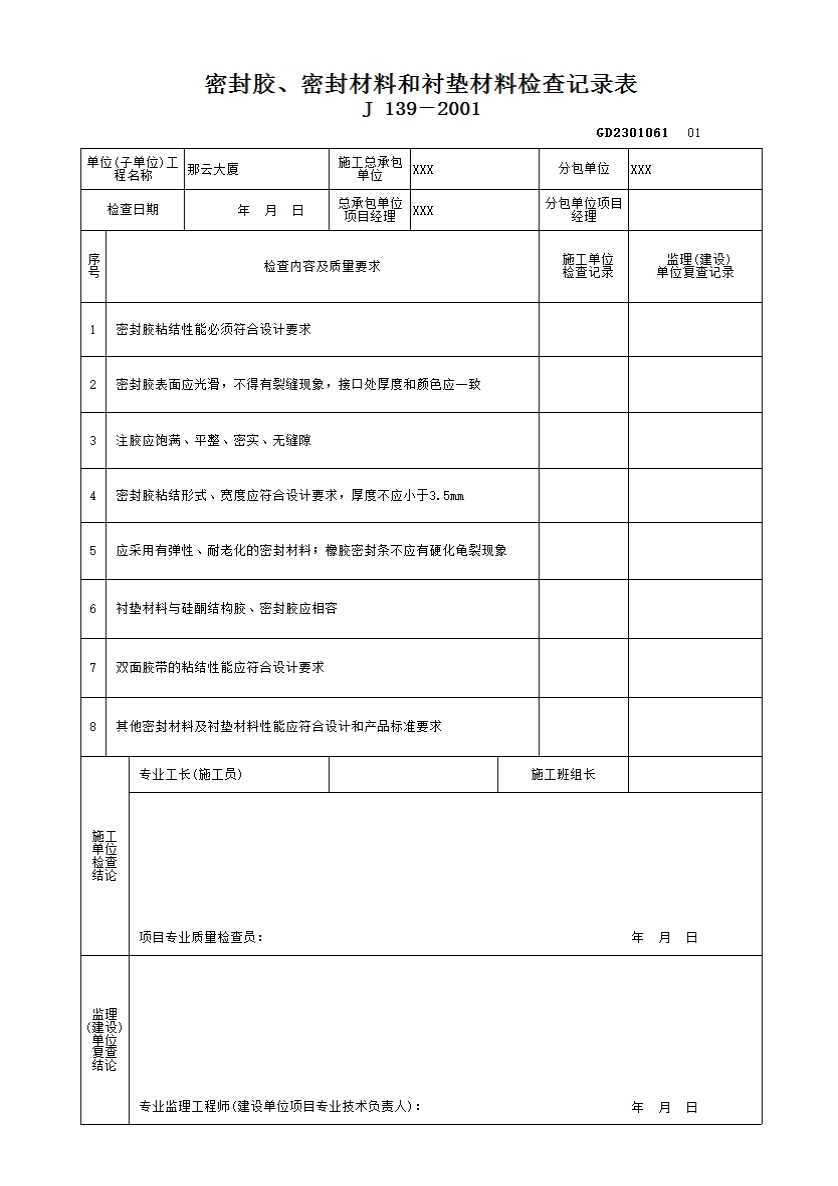 表格名称:密封胶、密封材料和衬垫材料检查验收记录表