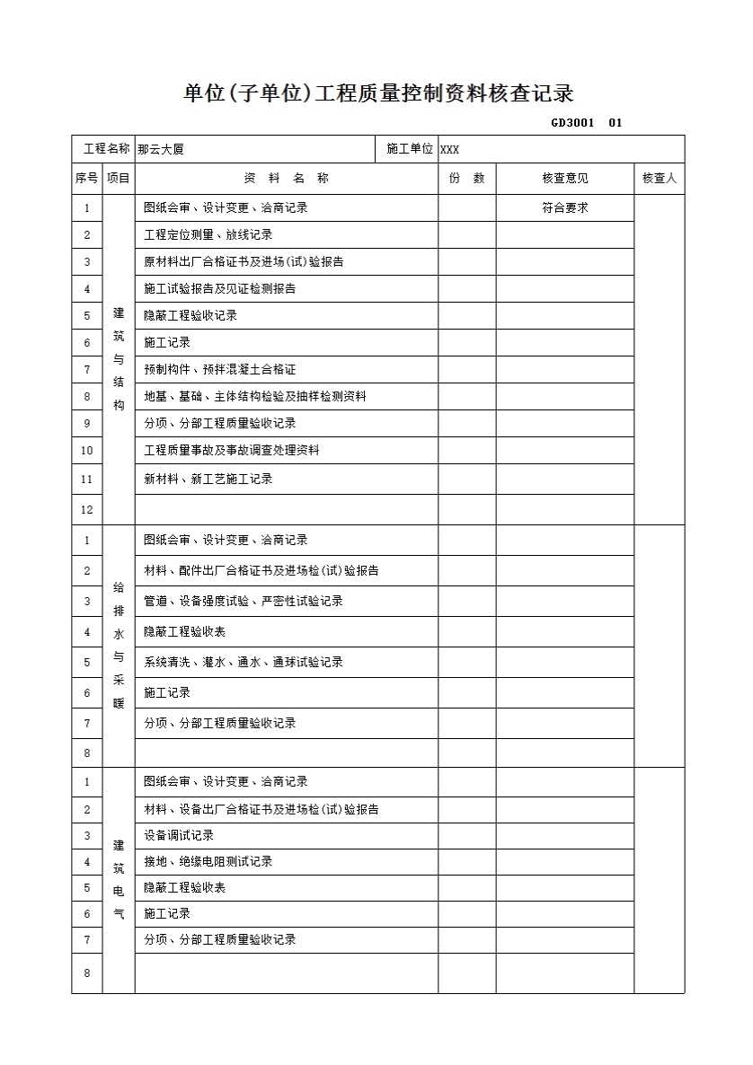 表格名称:单位(子单位)工程质量控制资料核查记录