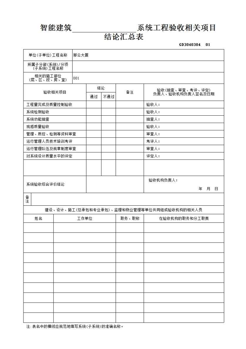 智能建筑各系统工程验收相关项目结论汇总表GD3040304