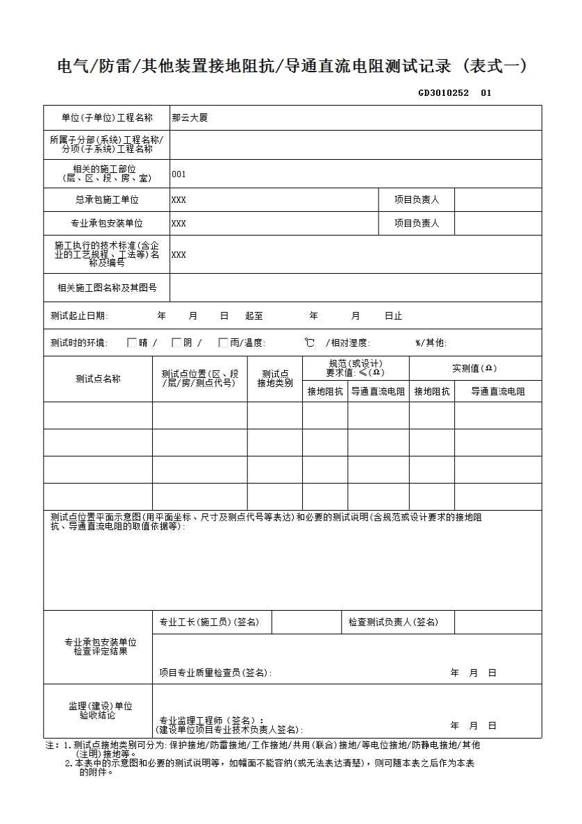 电气/防雷/其他装置接地阻抗/导通直流电阻测试记录 (表式一)GD3010252