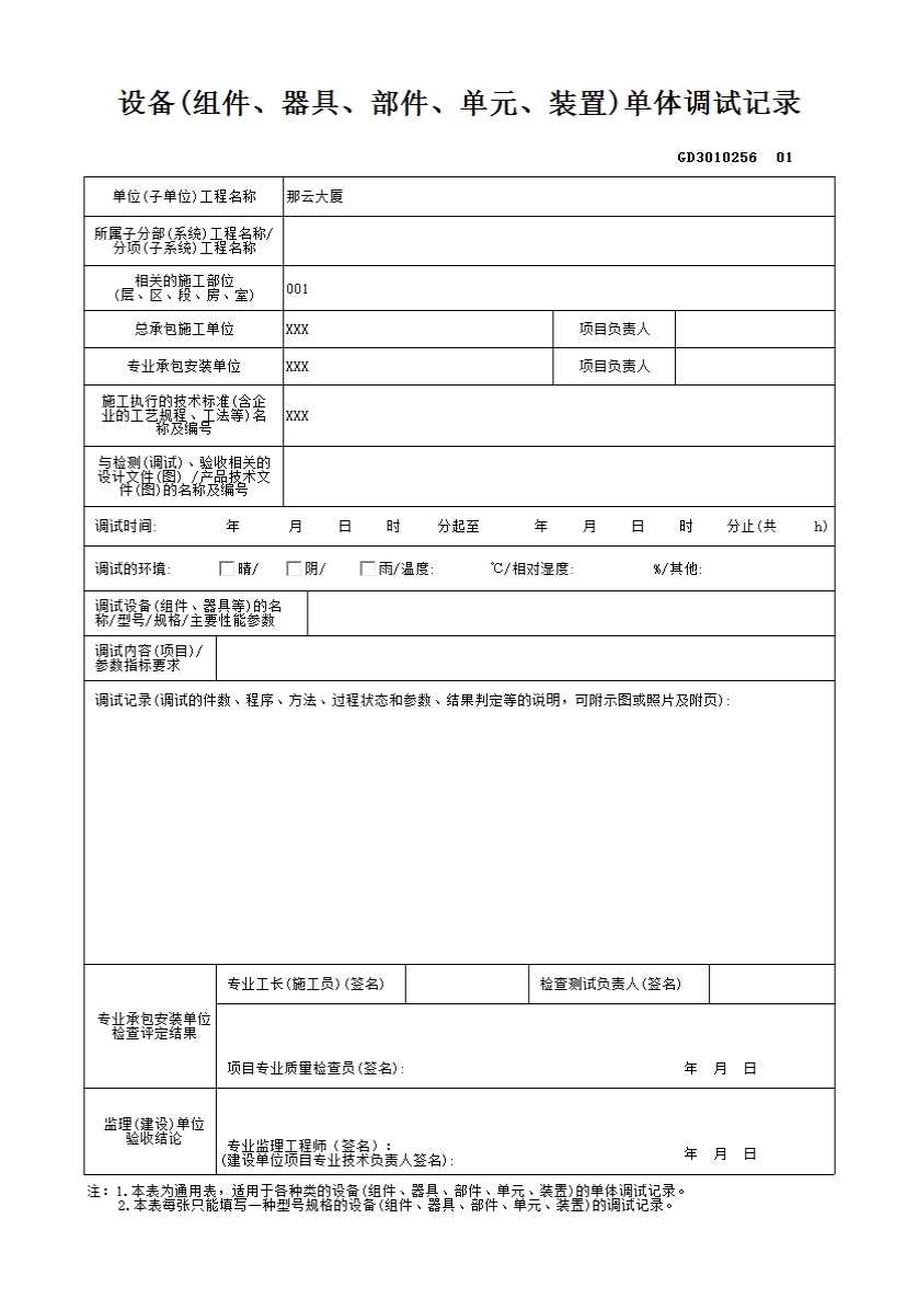 表格名称:设备(组件、器具、部件、单元、装置)单体调试记录GD3010256