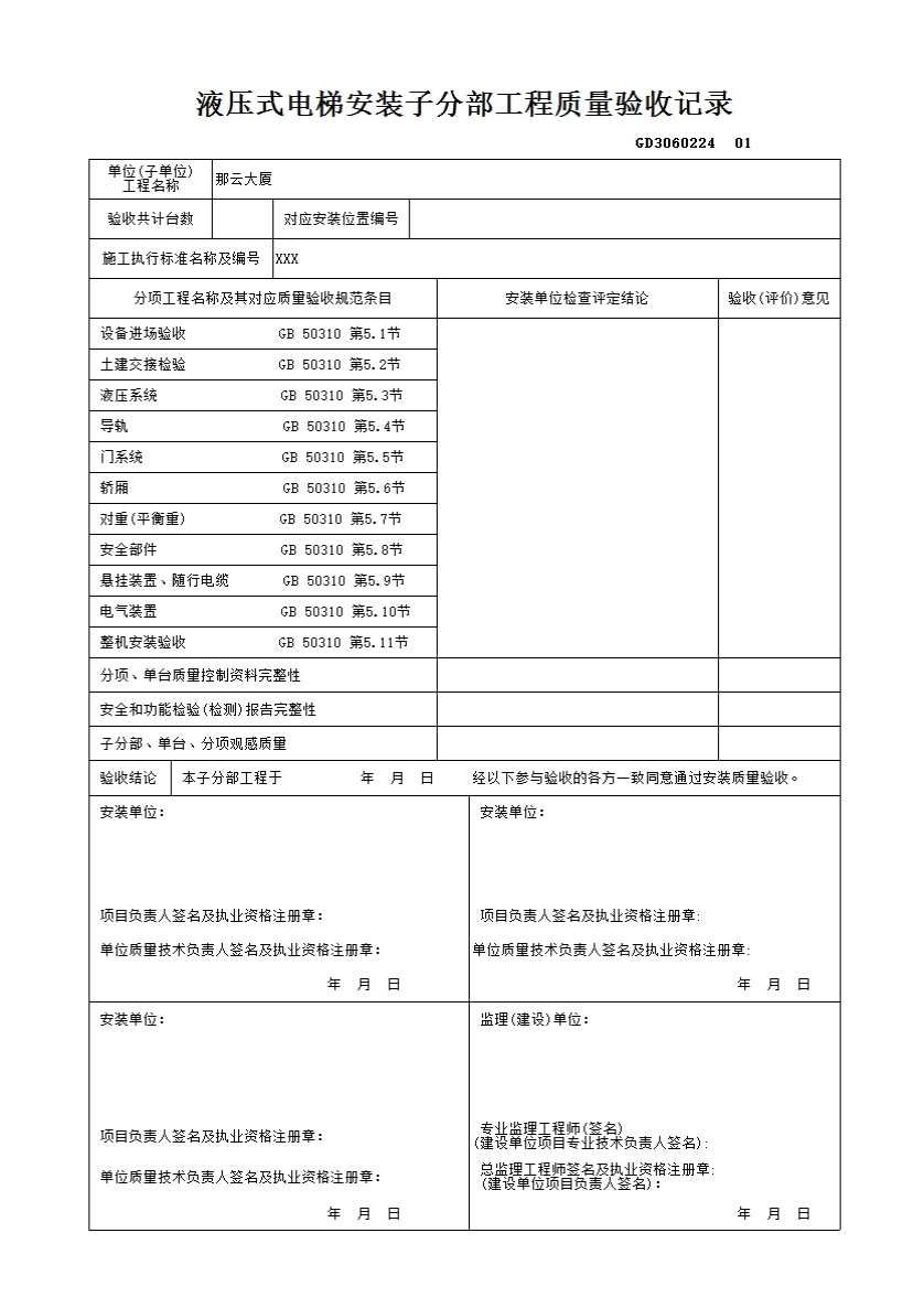 表格名称:液压式电梯安装子分部工程质量验收记录GD3060224