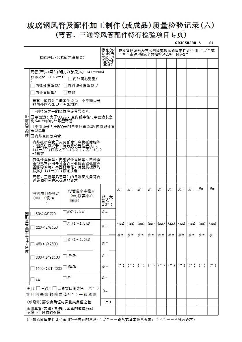 表格名称:玻璃钢风管及配件加工制作(或成品)质量检验记录(六)GD3050308-6