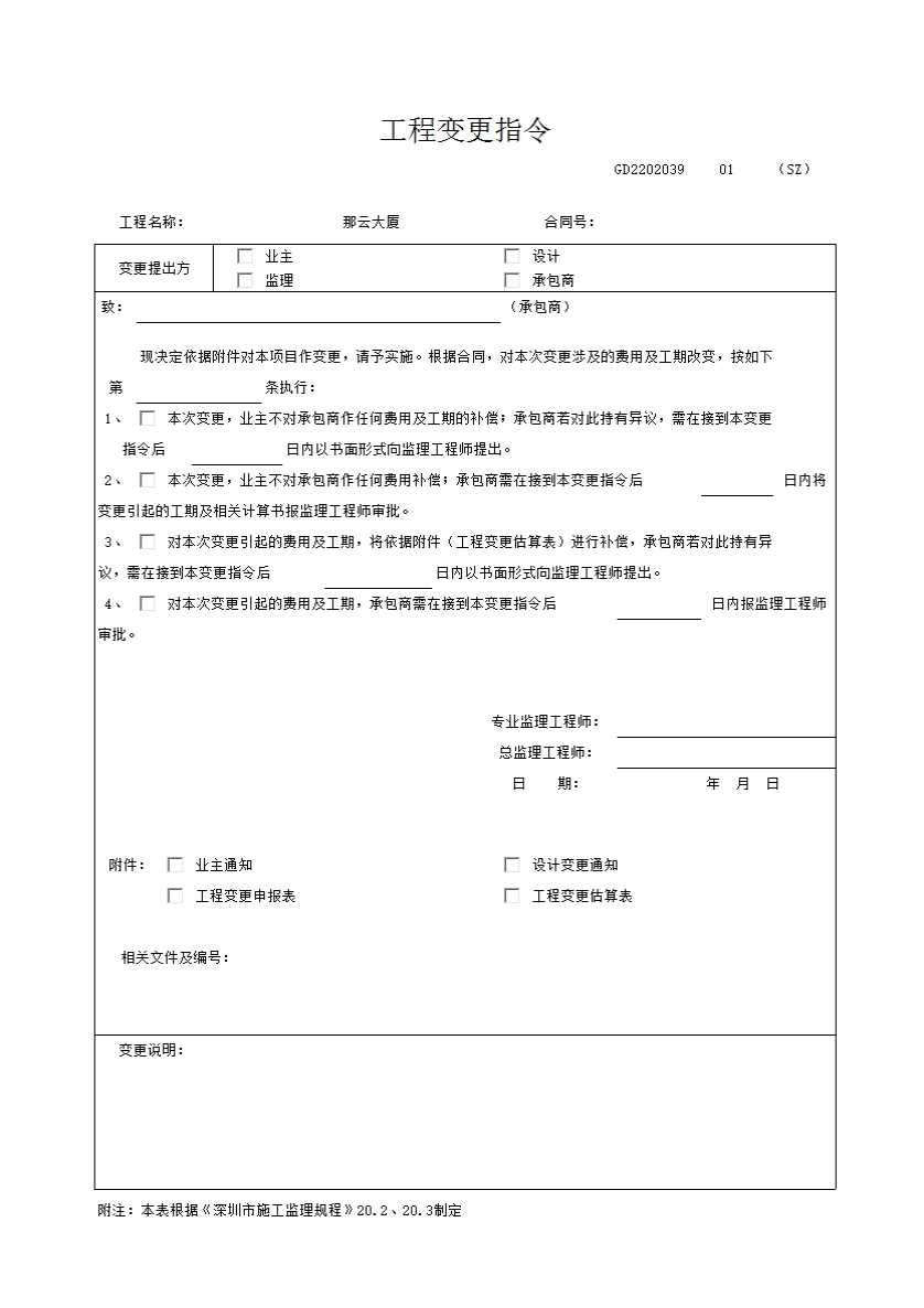 表格名称:工程变更指令