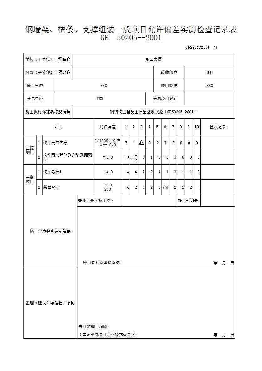 表格名称:钢墙架、檀条、支撑组装一般项目允许偏差实测检查记录表