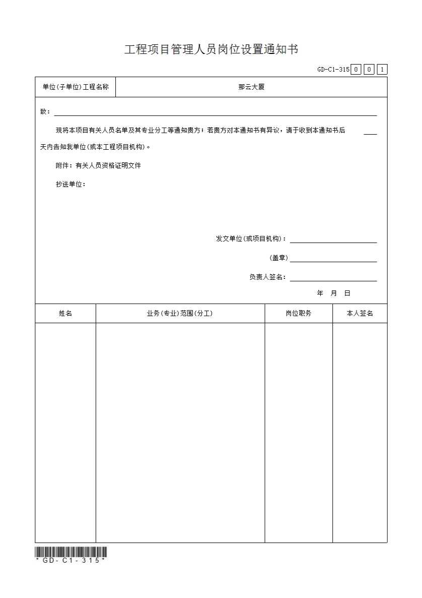 表格名称:3.1.5、工程项目管理人员岗位设置通知书