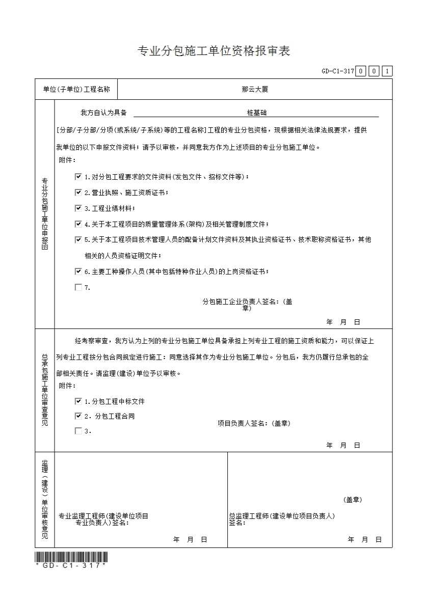3.1.7、专业分包施工单位资格报审表