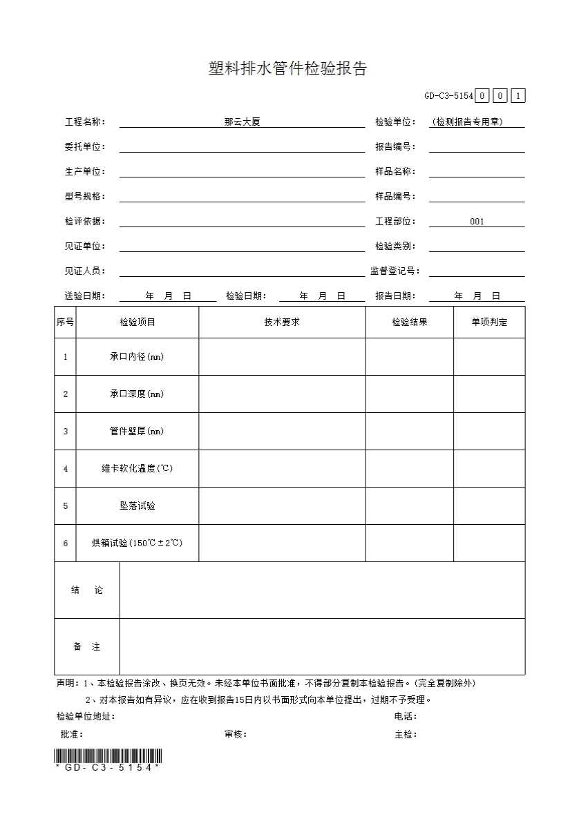 表格名称:5.1.54、塑料排水管件检验报告