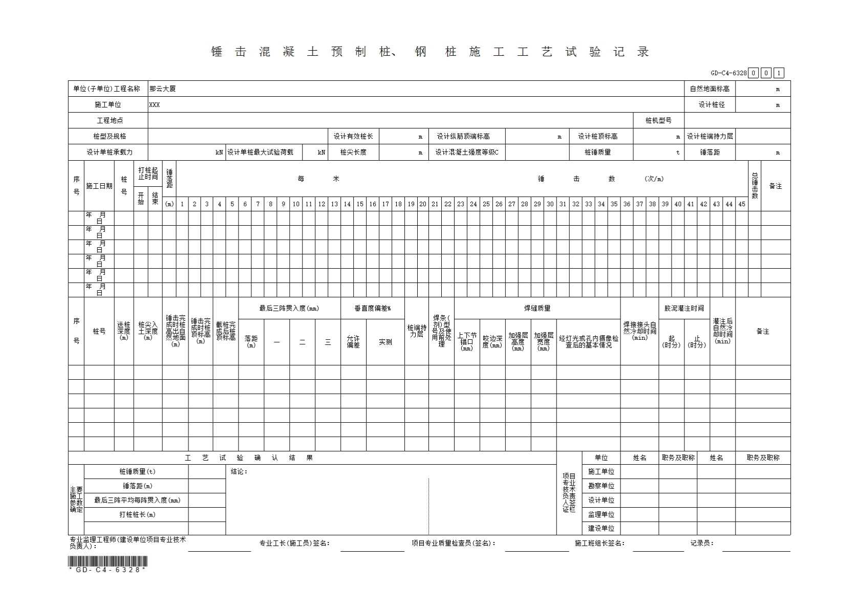 锤击混凝土预制桩钢桩施工工艺试验记录