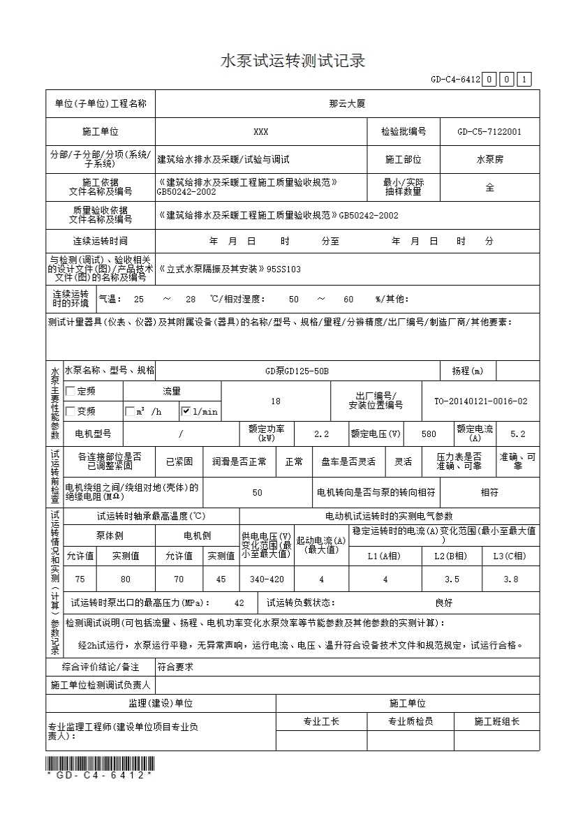 水泵试运转测试记录