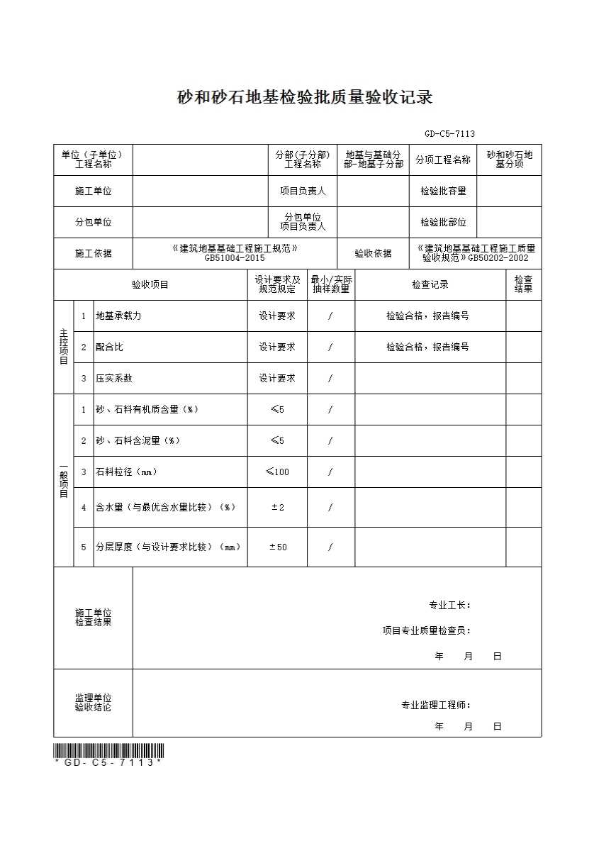 本表适用于砂和砂石地基工程的检验批质量验收记录。