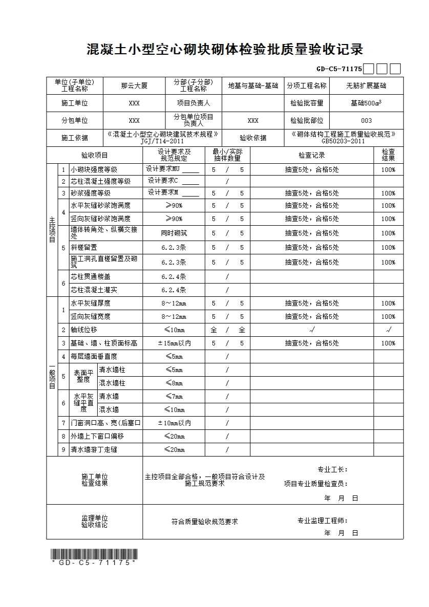 1.小砌块和芯柱混凝土、砌筑砂浆的强度等级:必须符合设计要求。