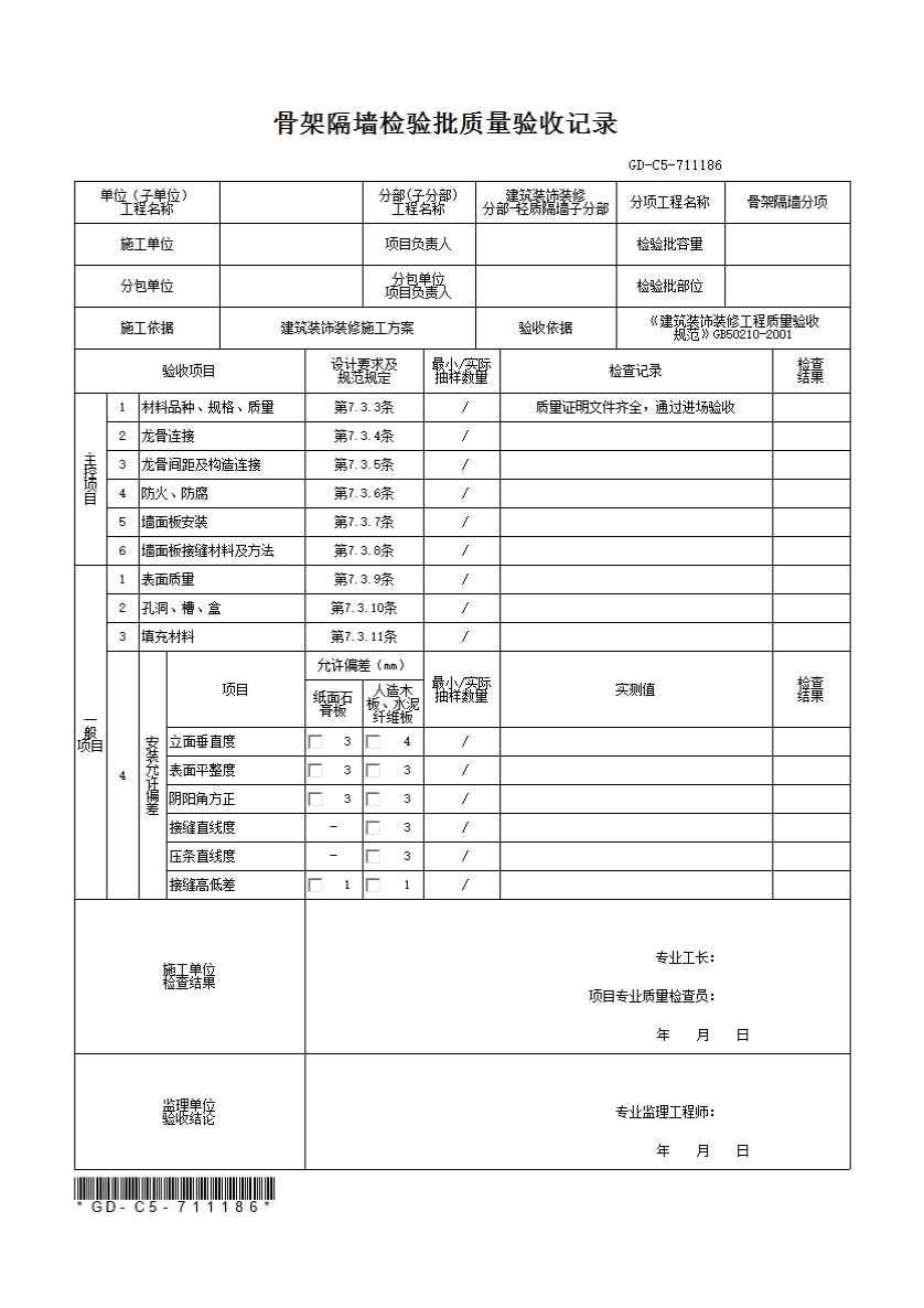 1.材料品种、规格、质量:骨架隔墙所用龙骨、配件、墙面板、填充材料及嵌缝材料的品种、规格、性能和木材的含水率应符合设计要求。有隔声、隔热、阻热、防潮等特殊要求的工程,材料应有相应性能等级的检测报告。