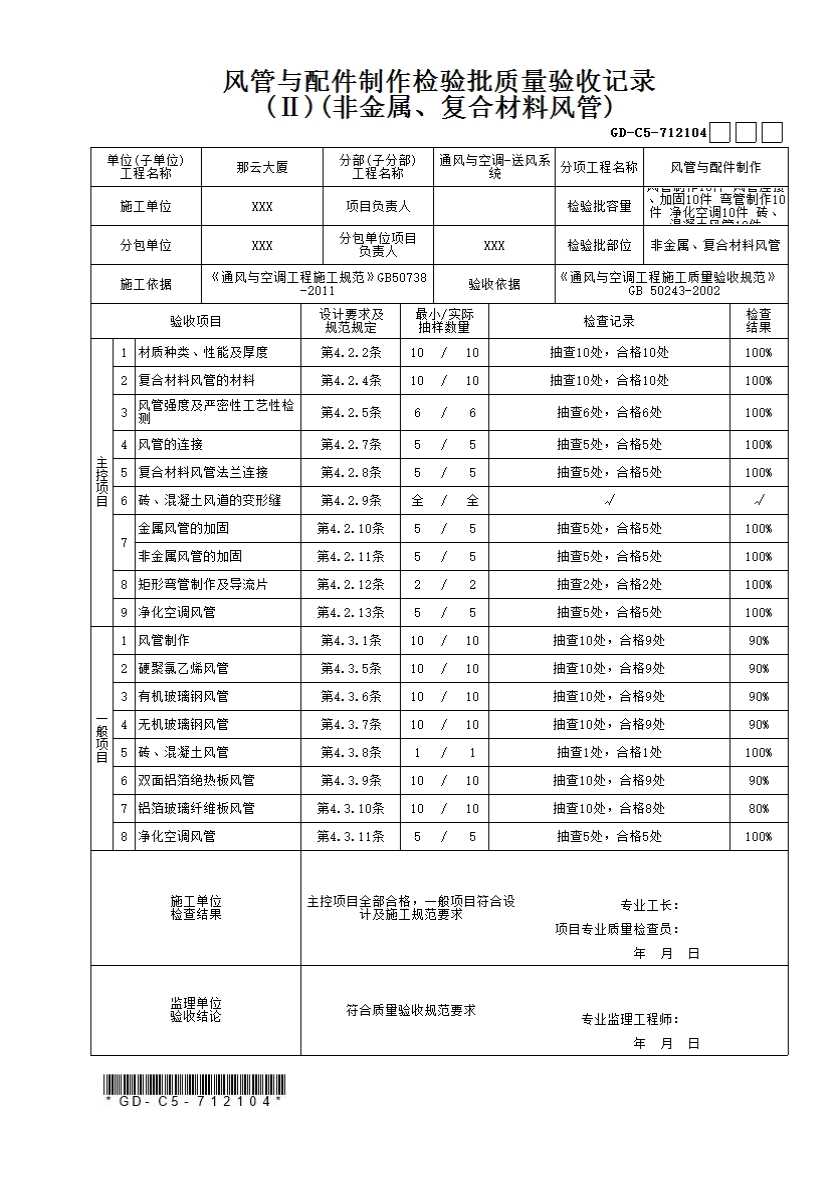 (1)检查数量:通风与空调工程按制作数量10%抽查,不得少于5件;净化空调工程按制作数量抽过20%,不得少于5件。