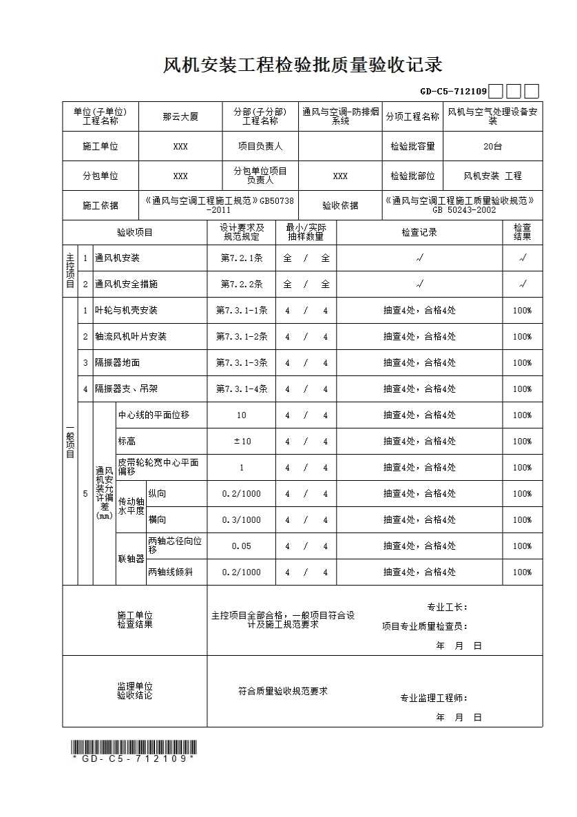 风机安装检验批质量验收记录