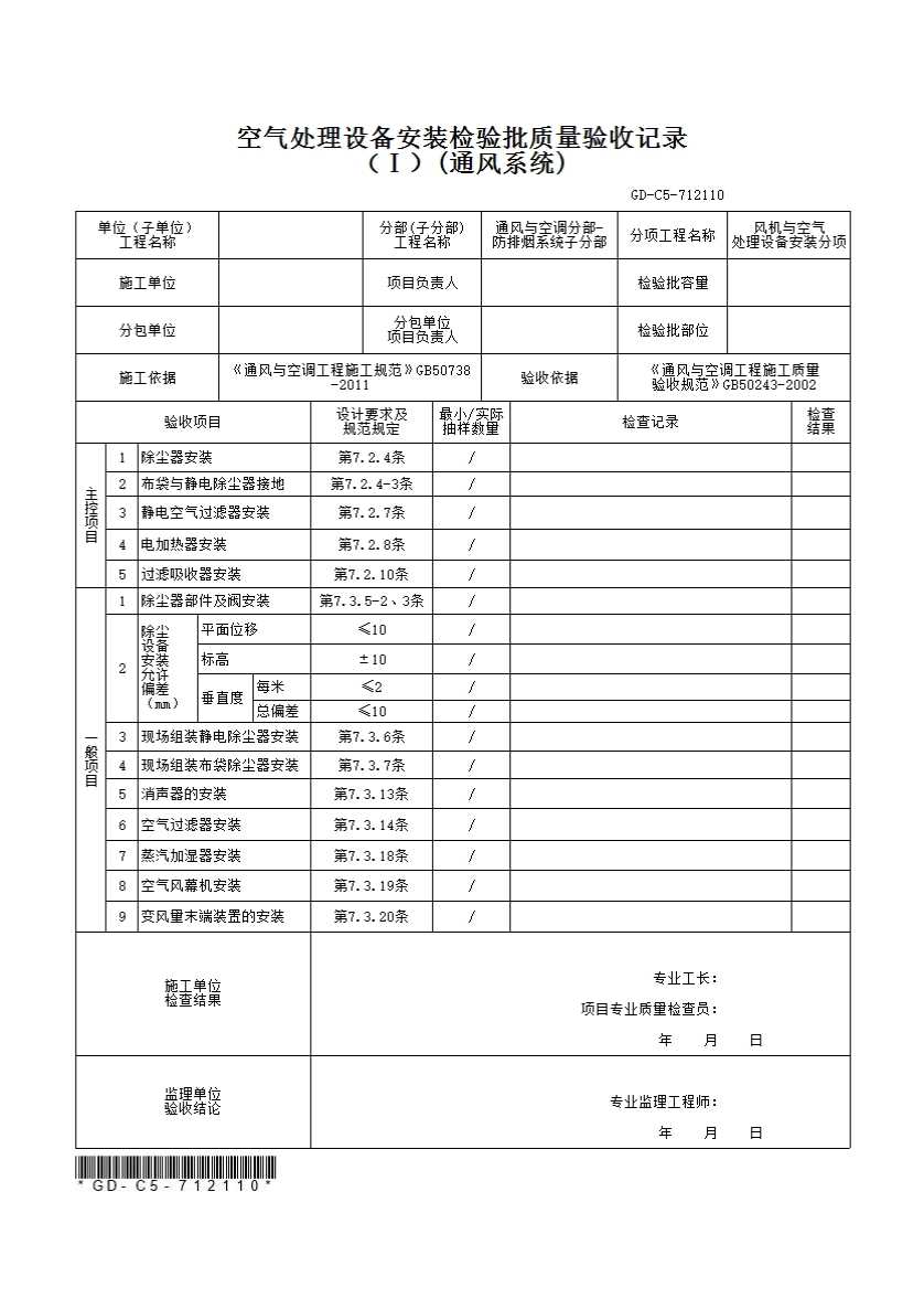 空气处理设备安装检验批质量验收记录(Ⅰ)(通风系统)