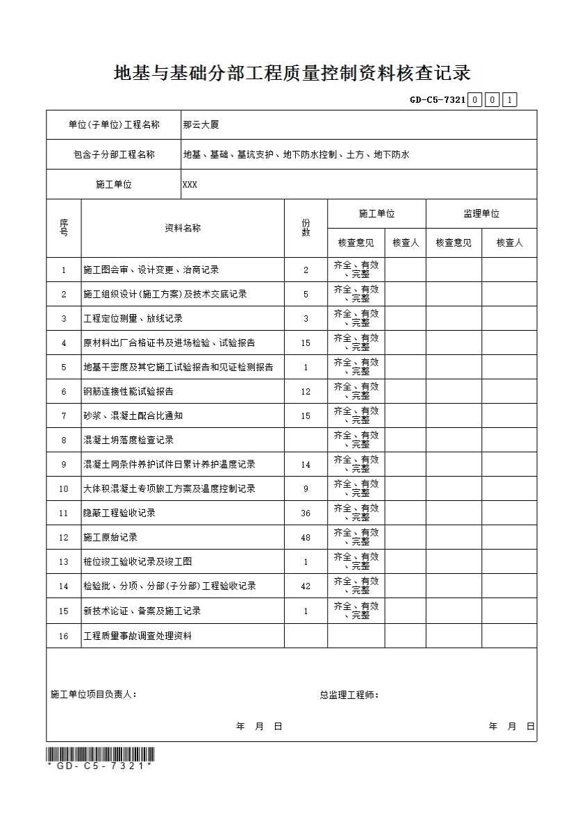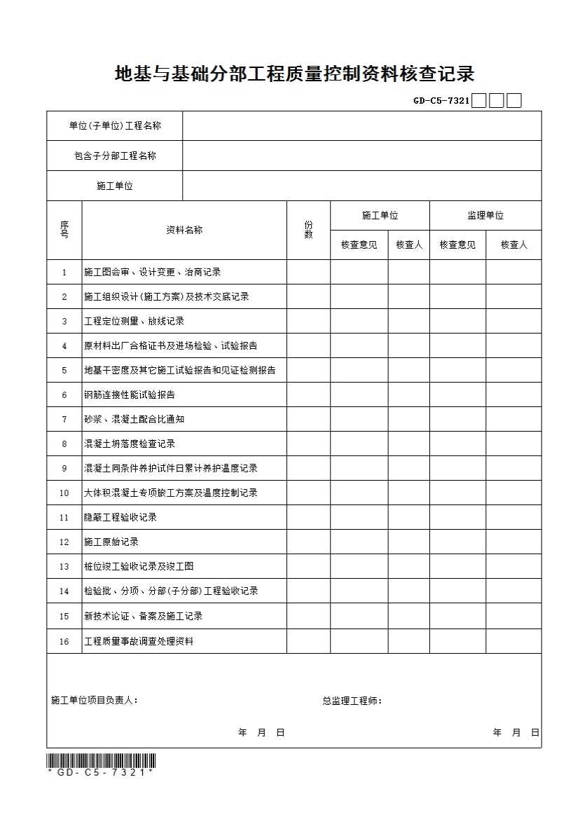 表格名称:地基与基础分部工程质量控制资料核查记录