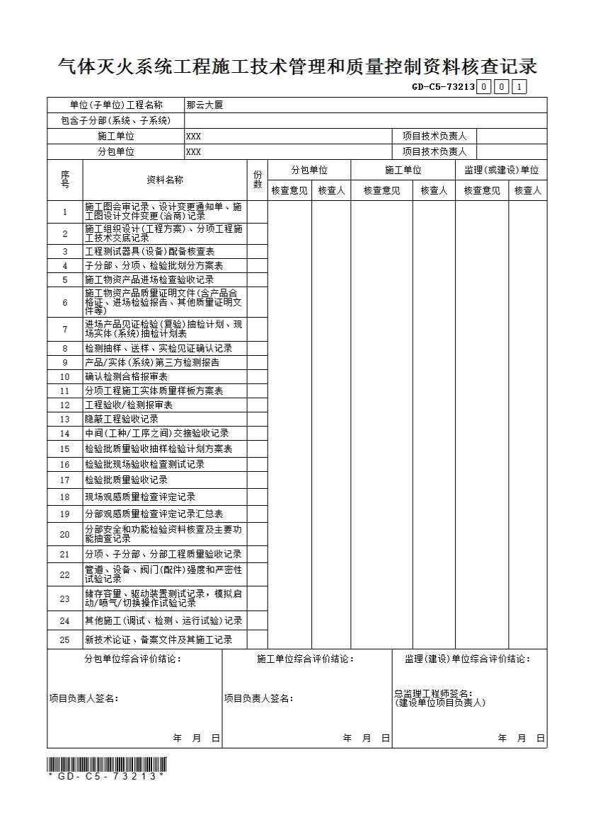 气体灭火系统工程施工技术管理和质量控制资料核查记录