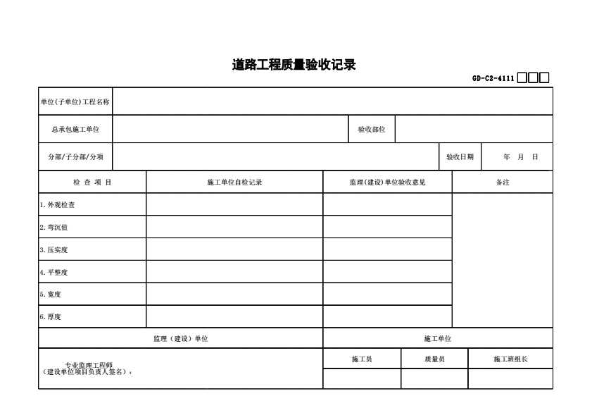 表格名称:GD-C2-4111 道路工程质量验收记录