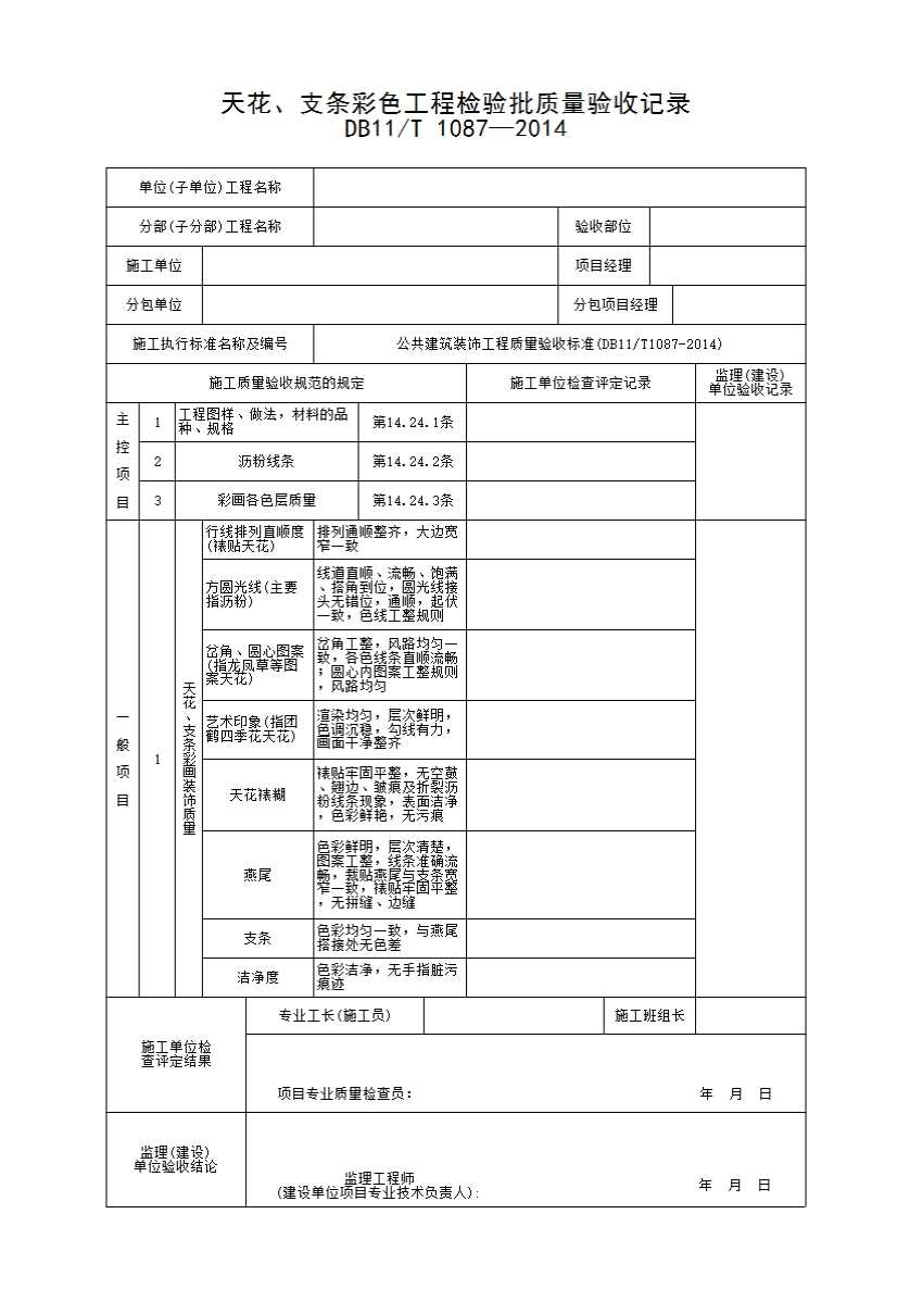 表格名称:天花、支条彩色工程检验批质量验收记录