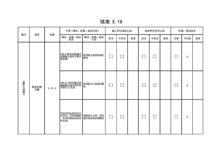 表格名称:表E.18 系统整体联动控制功能调试、检测、验收记录(续表3)