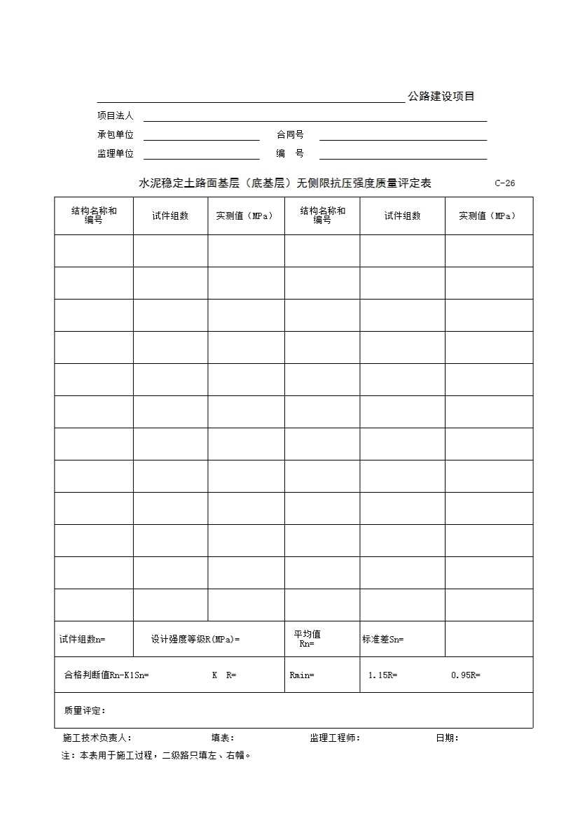 表格名称:C-26 水泥稳定土路面基层(底基层)无侧限抗压强度质量评定表