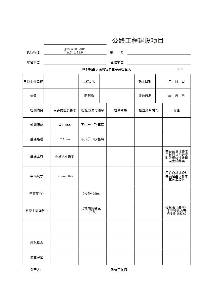 表格名称:I-3表 结构物基坑底现场质量综合检查表