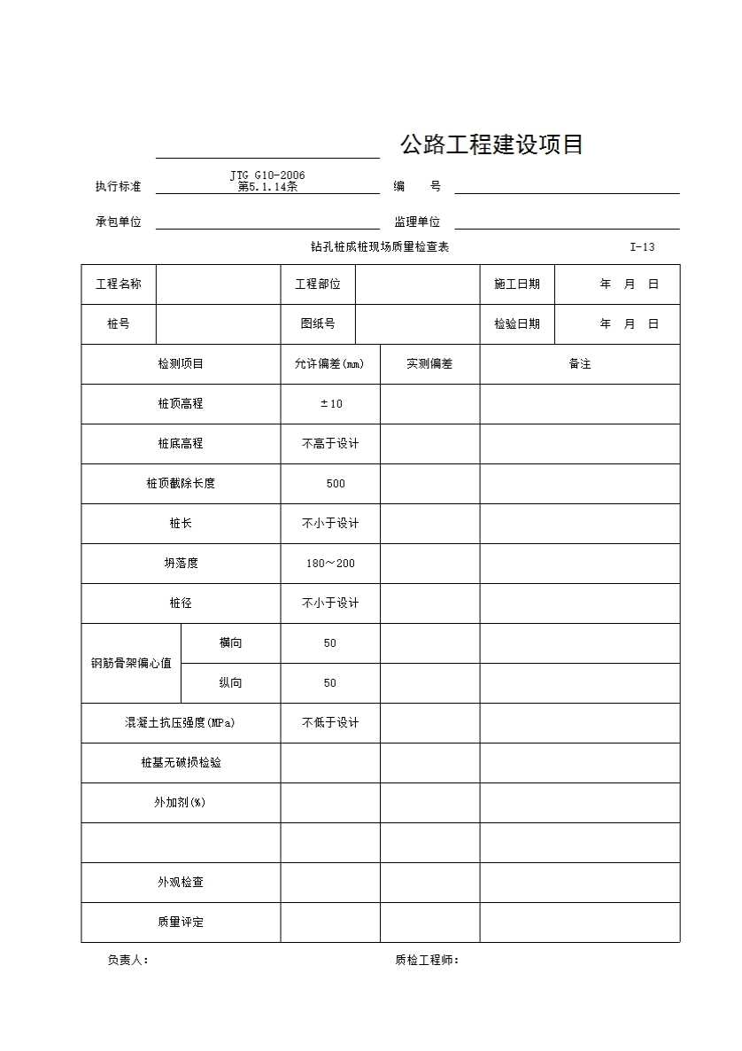 表格名称:I-13表 钻孔桩成桩现场质量检查表