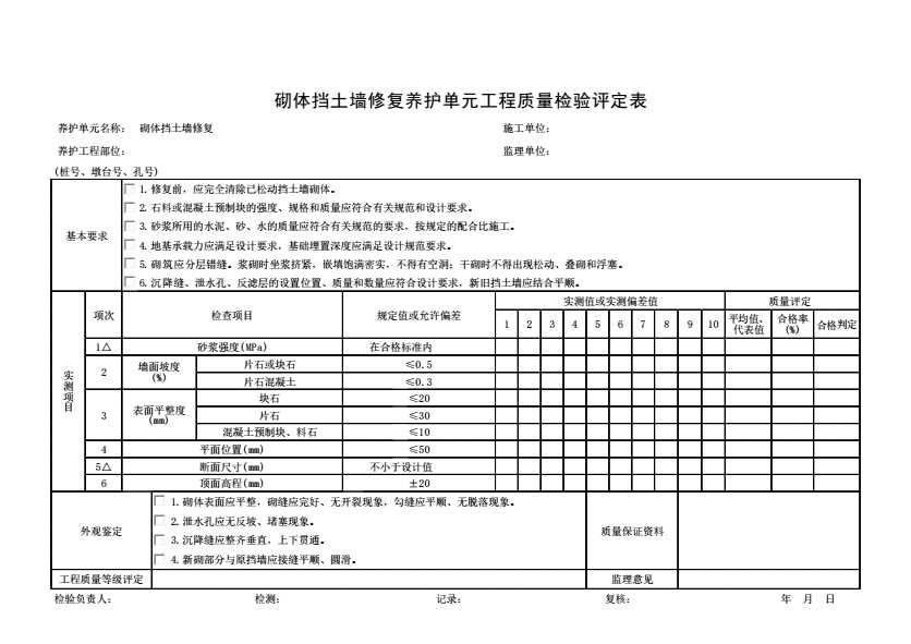 表格名称:砌体挡土墙修复养护单元工程质量检验评定表