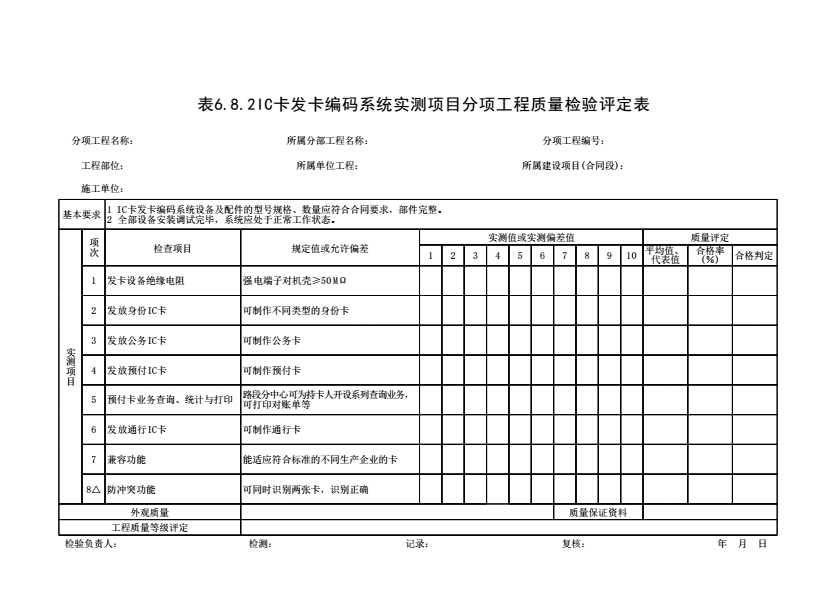 表格名称:表6.8.2 IC卡发卡编码系统实测项目分项工程质量检验评定表