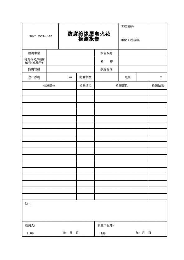 表格名称:SH/T 3503-J120 防腐绝缘层电火花检测报告