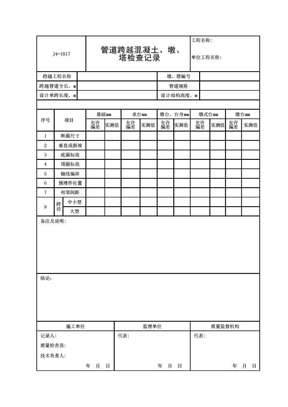 表格名称:J4-1017 管道跨越混凝土墩、塔检查记录
