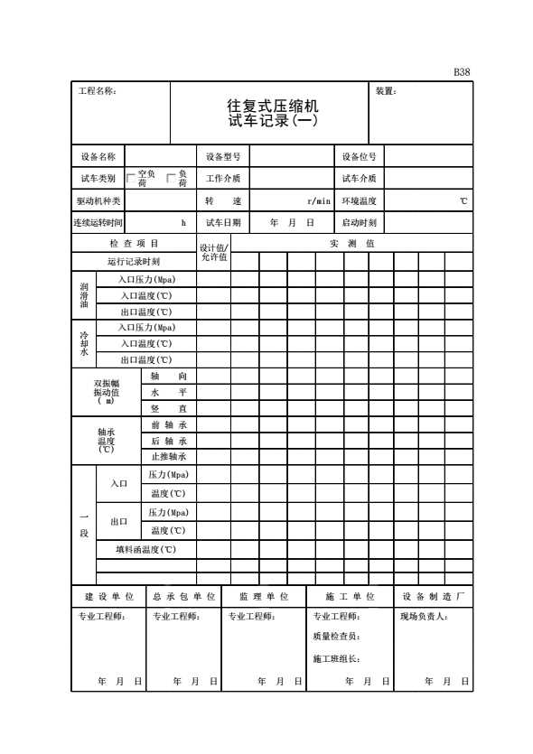 表格名称:B38 往复式压缩机试车记录(一)