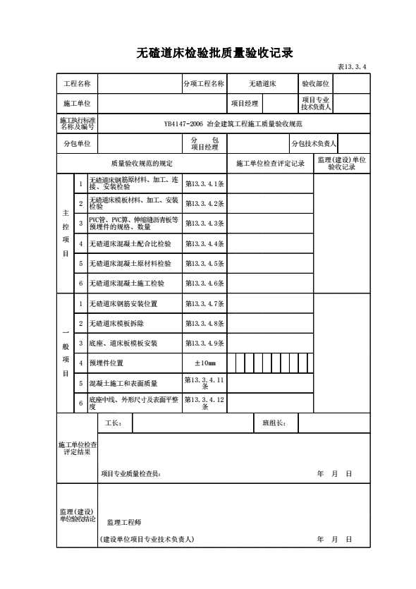 表格名称:表13.3.4 无碴道床检验批质量验收记录