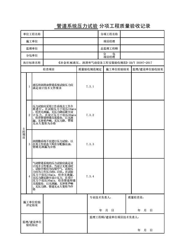 表格名称:管道系统压力试验分项工程质量验收记录