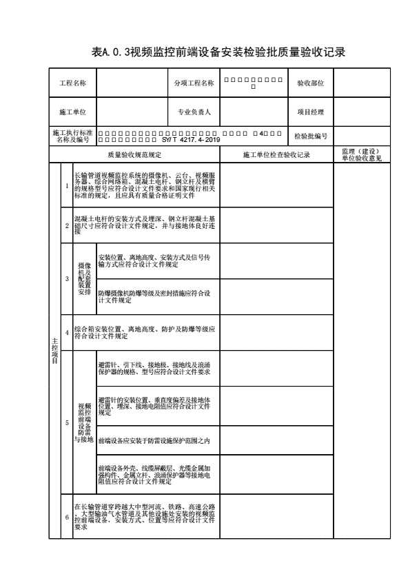 表格名称:表A.0.3 视频监控前端设备安装检验批质量验收记录