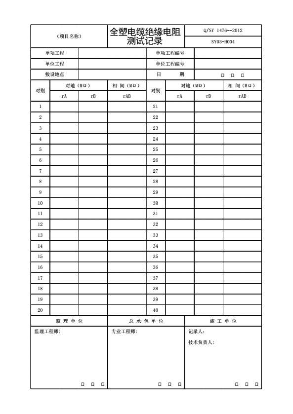 表格名称:SY03-H004 全塑电缆绝缘电阻测试记录