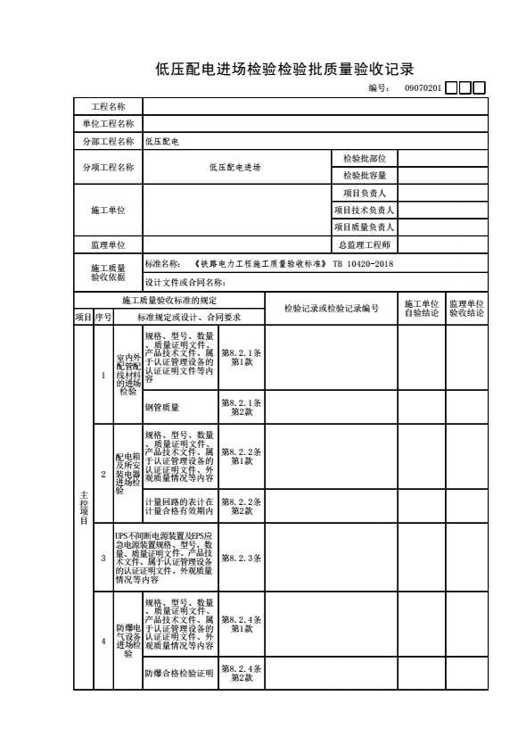 表格名称:09070201 低压配电进场检验检验批质量验收记录