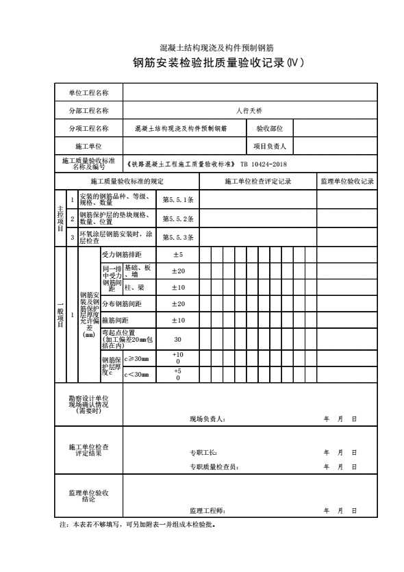 表格名称:【混凝土结构现浇及构件预制钢筋】钢筋安装检验批质量验收记录(Ⅳ)