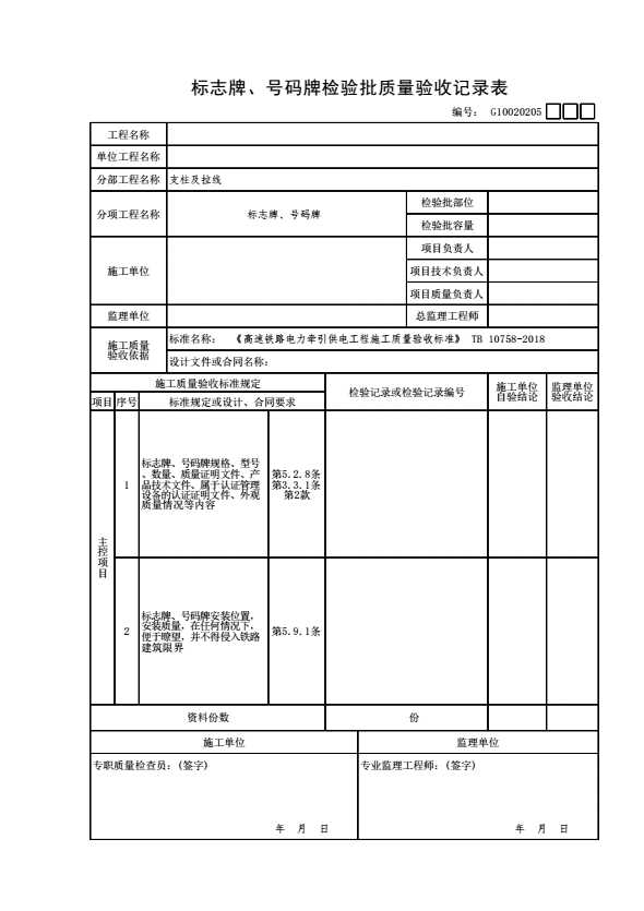 G10020205 标志牌、号码牌检验批质量验收记录表