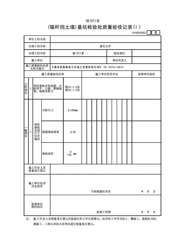 表格名称:G04020202 【锚(杆)索】(锚杆挡土墙)基坑检验批质量验收记录(Ⅰ)