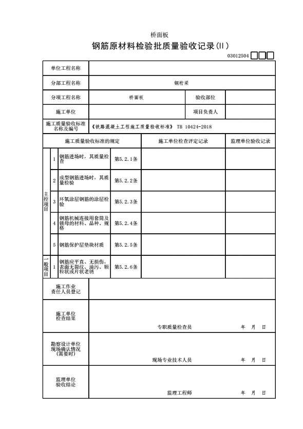 表格名称:03012504 钢筋原材料检验批质量验收记录(Ⅱ)