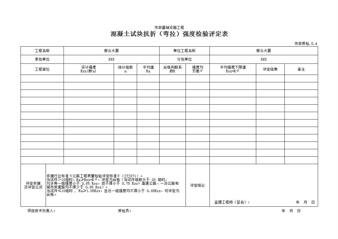 表格名称:市政质检0.4混凝土试块抗折(弯拉)强度检验评定表