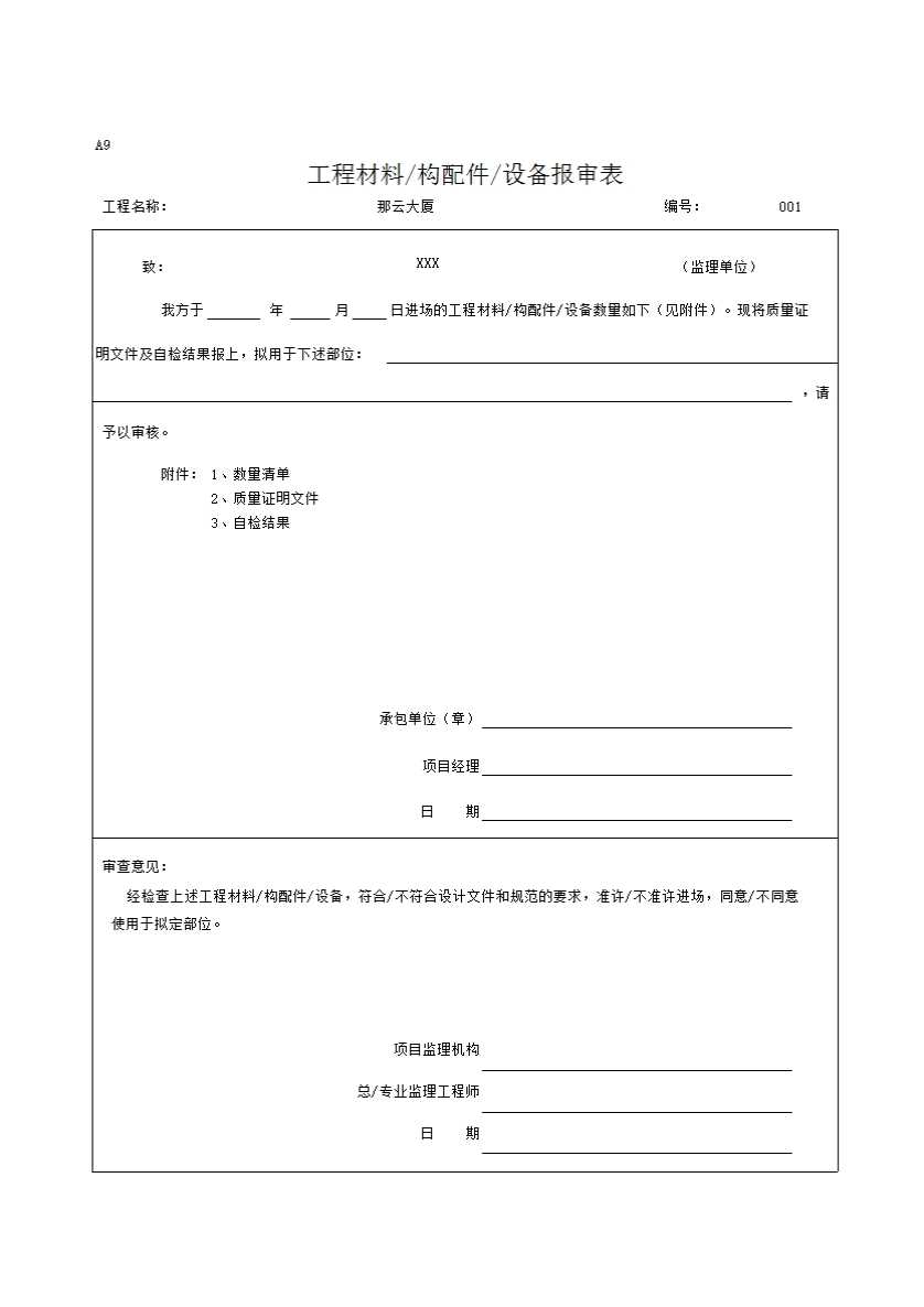 表格名称:A9工程材料构配件设备报审表