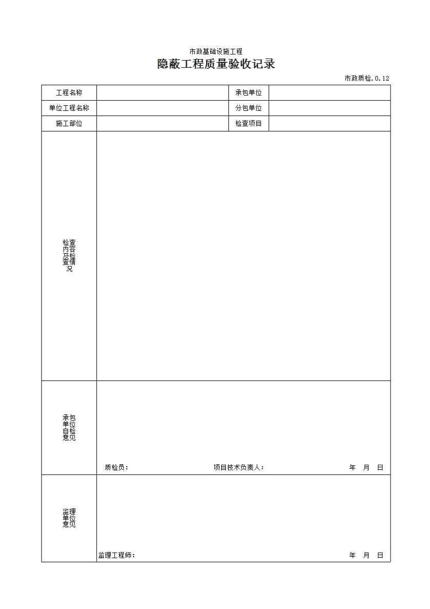 市政质检0.12隐蔽工程质量验收记录