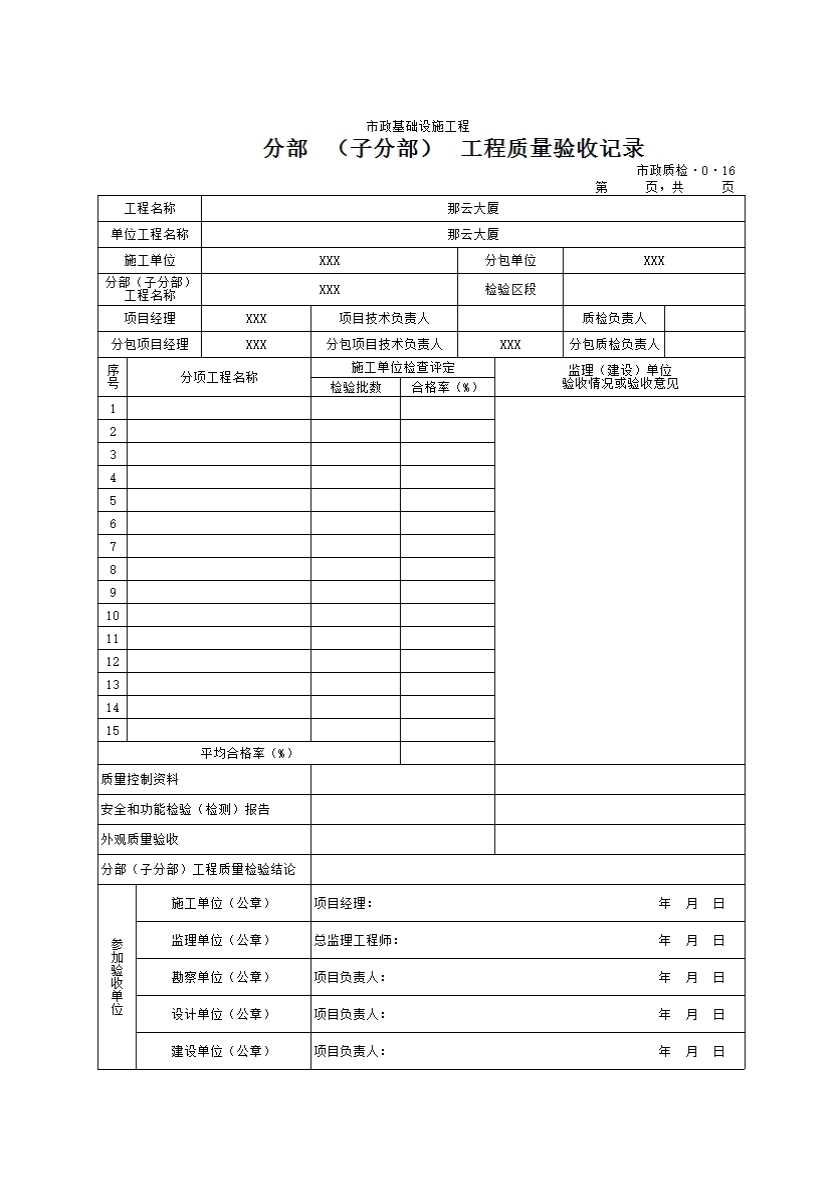 表格名称:市政质检0.16分部(子分部)工程质量验收记录