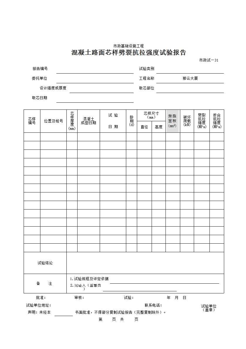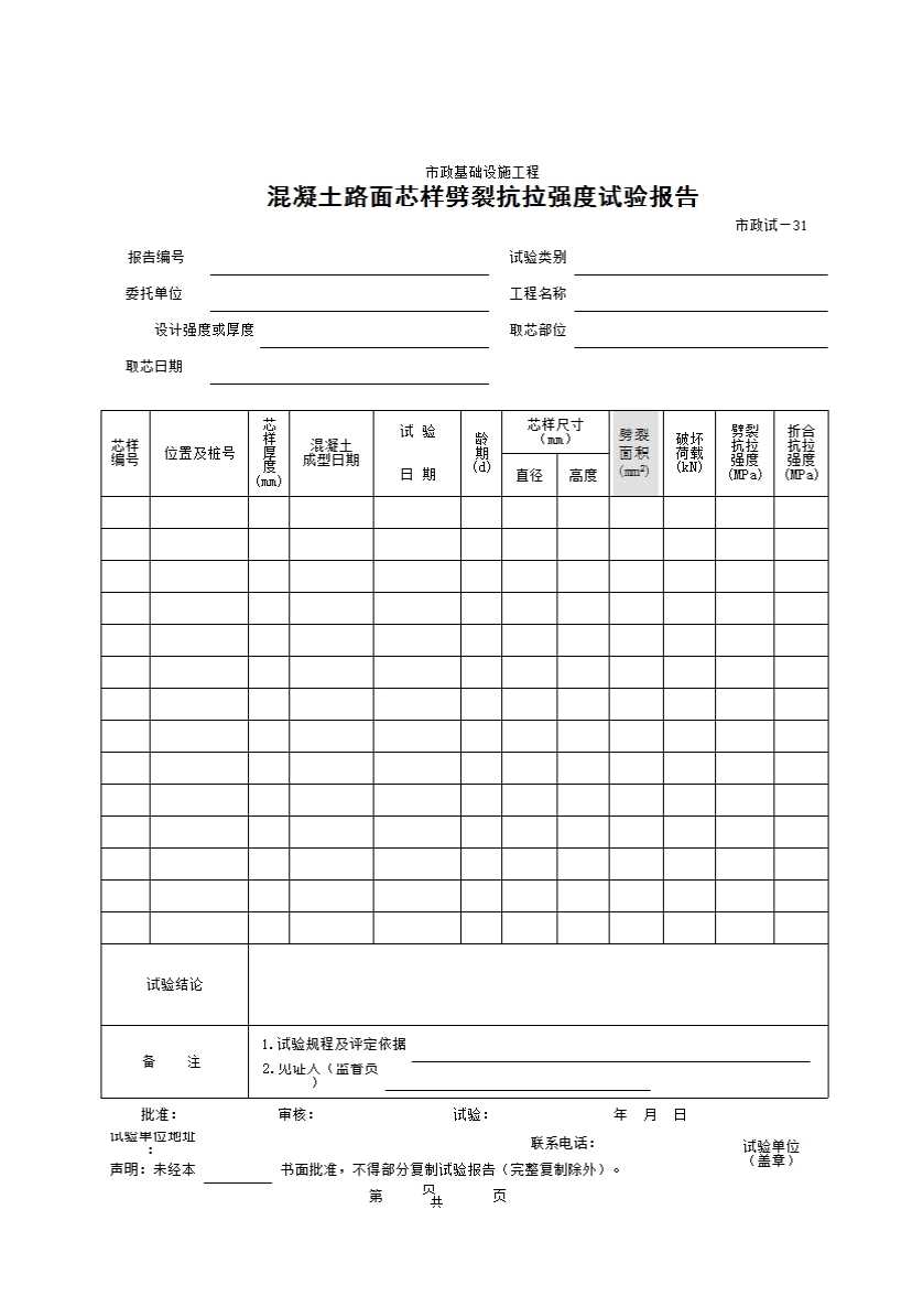 表格名称:市政试-31混凝土路面芯样劈裂抗拉强度试验报告